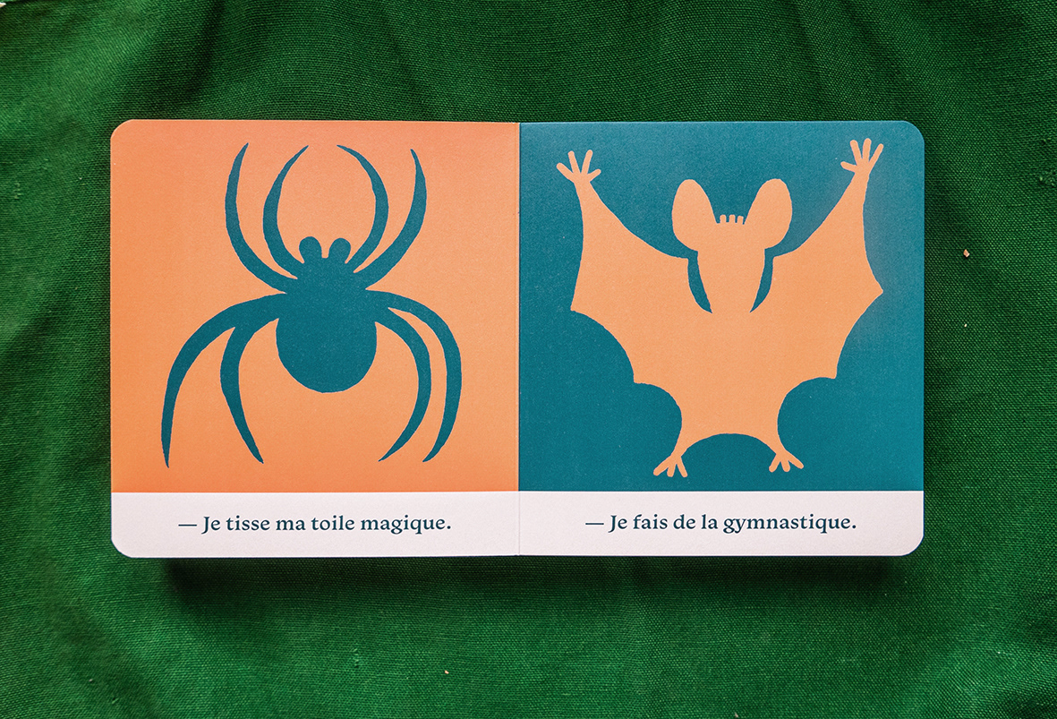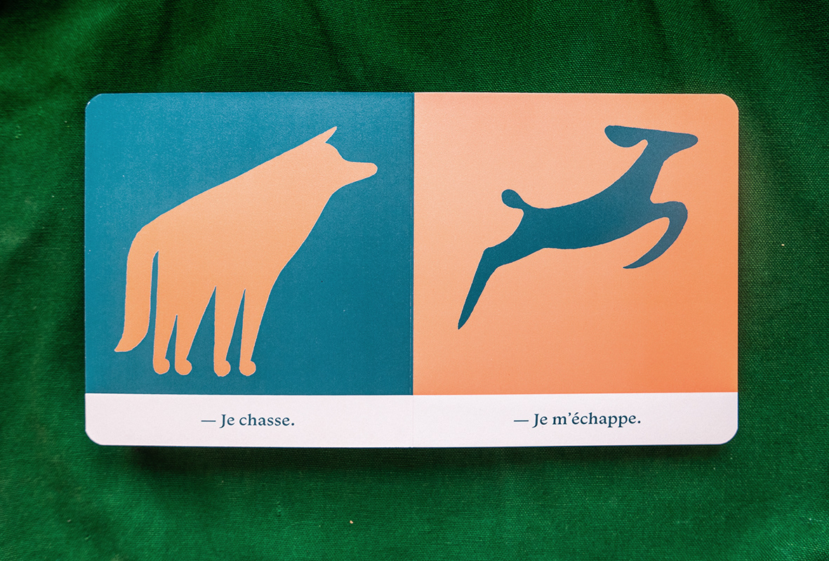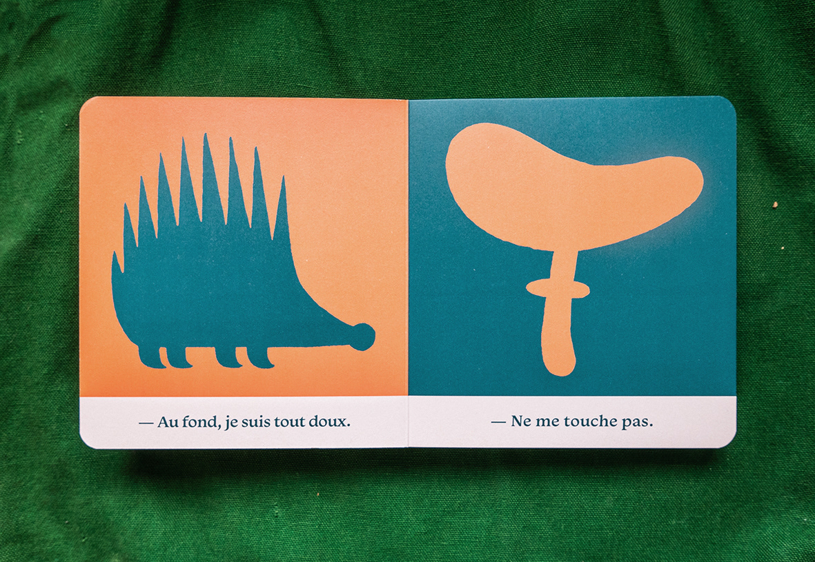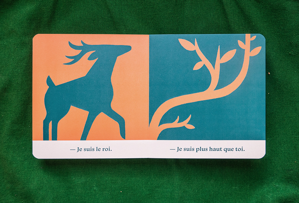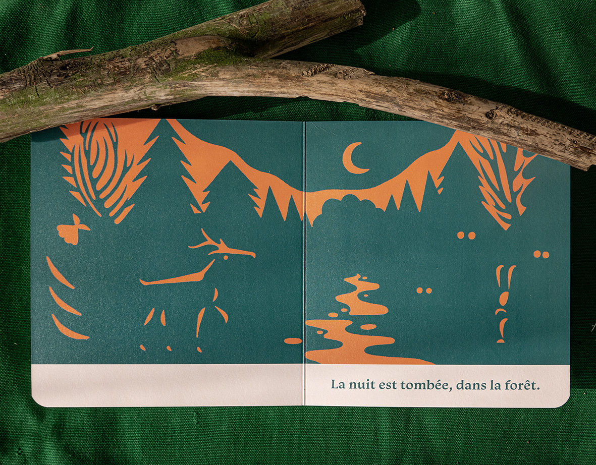 30 pages, 15 x 16 cm. La forêt bruisse et s’anime de toutes les vies qui la traversent. Avec des dialogues tout simples et sonnants et des images stylisées en tons directs (vert et roux), chaque rencontre raconte la singularité des êtres — animaux, végétaux et éléments qui parcourent les bois. Du loup au lièvre, de l’écureuil à la bogue du marron, de la chauve-souris au cerf… que de débuts d’histoires à imaginer !
